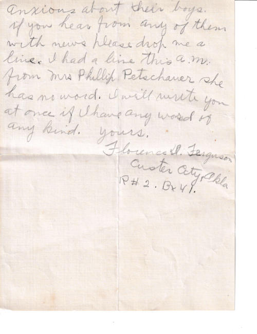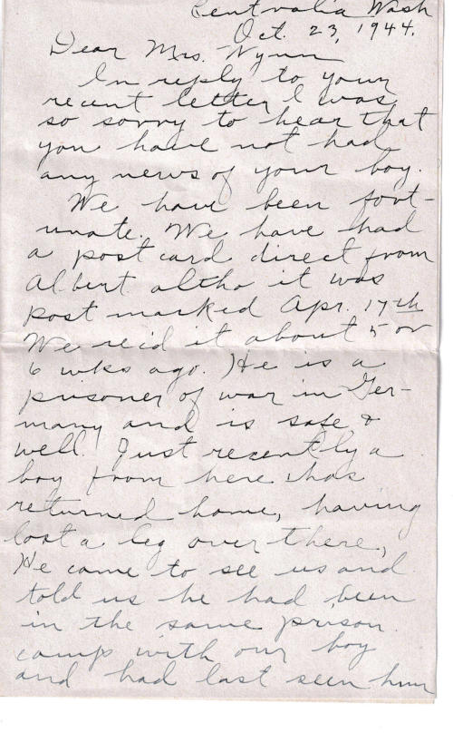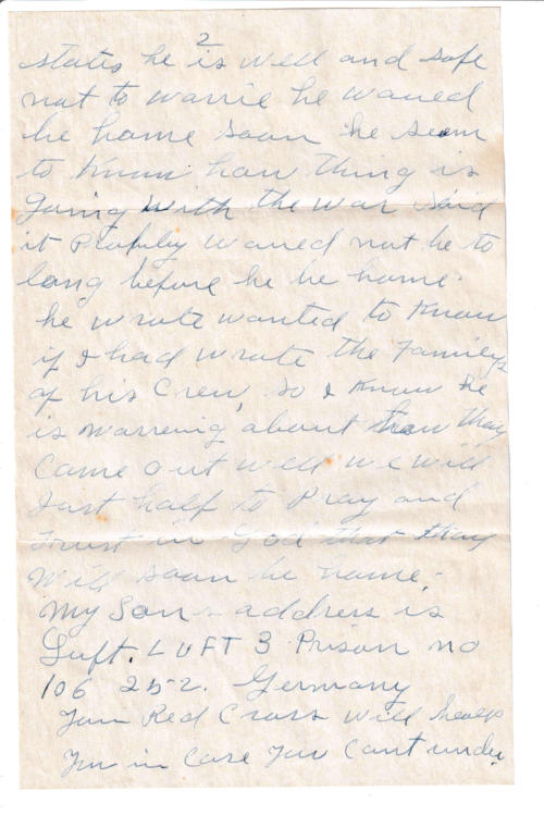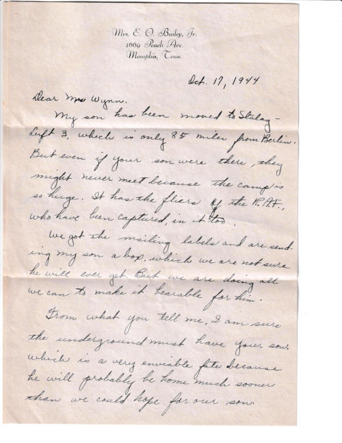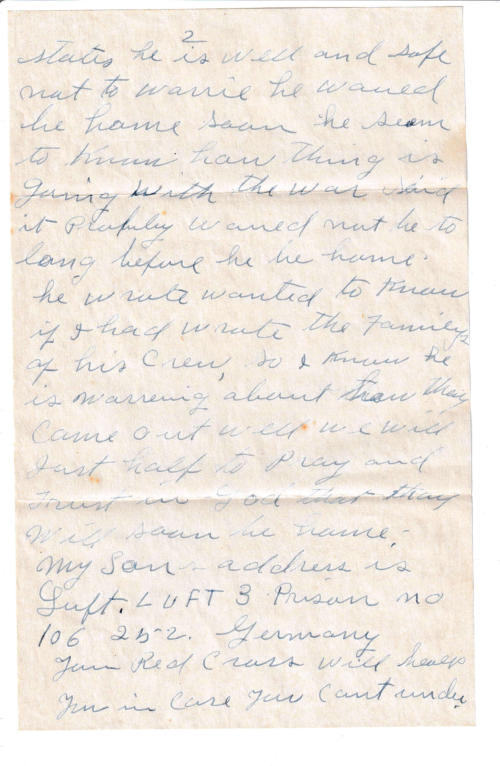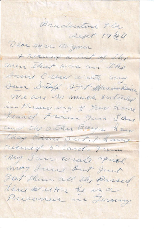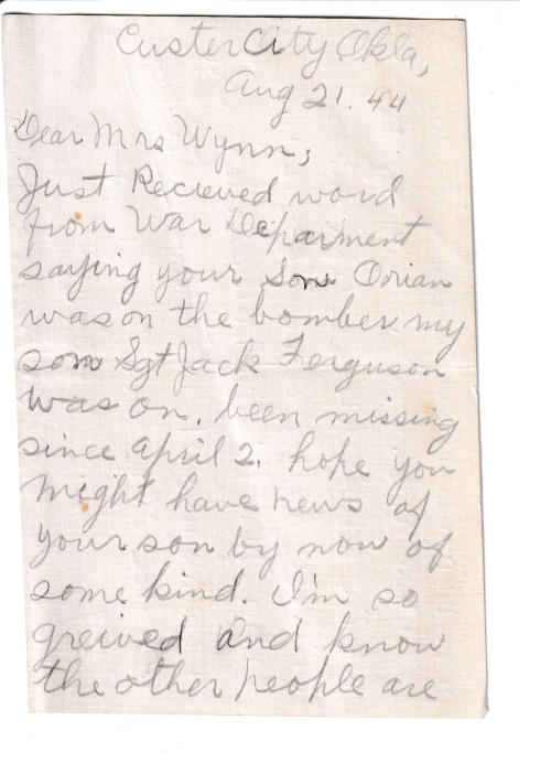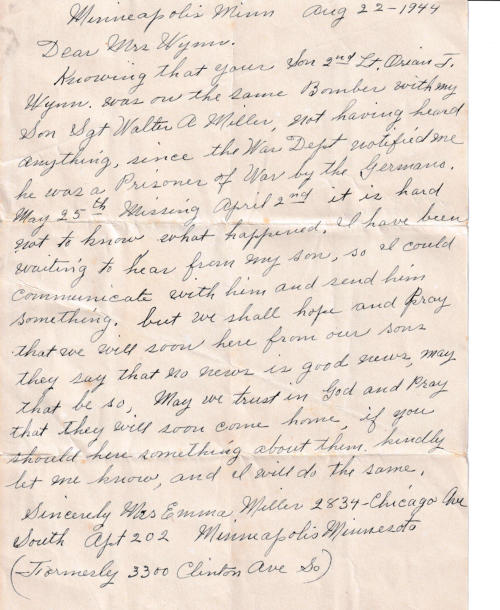 -----------------------------------------------------------------------------------------------1c CREW SECTION (Docs down below)*Other than Wynn & Zuidema-Records. Preserved Docs in Family *heritage)*B*Backman, Albert •POW•Correspondence -see rightoBackman, Edith (Mrs.) (by Mail); Address: 823 G St.. Centralia, WAoDate(s): ▪1944/08/29 ▪1944/10/25. sent to Anallene Wynn. Letter itself shows 1944/10/23: Mentions a postcard directly from Albert postmarked April 17. 1944 which said he is "a prisoner of war in Germany and is safe and well." Also, someone from "here" - her area - said "he had been in the same prison camps with our boy [Albert] and had last seen him in August. Was able to send a parcel and letter to Albert, having received official instructions from the War Department.Bailey Jr, Ed•(Navigator) Stalag-Luft 3•POW •Correspondence oBailey, Peggy (Mrs. E. O. Bailey, Jr. ) 1669 Peach Ave, Memphis, TNoDates: ▪1944/10/17 Correspondent material: son moved to Stalag-Luft 3, only 85 miles from Berlin. 1944/10/17 the camp where her son was held also had the fliers of the R.A.F as captives, as well. Peggy had two younger sons she felt would probably fight in the Pacific, "a mighty bad lot." Second hand information that an eyewitness in another plane saw Orian's plane going down; before that 7 parachutes open [later Zuidema said only 3 bailed using parachutes]*F*Ferguson, Jack L. (Sgt) •MIA•Was on bomber with Orian, MIA was one of several listed missing in action•Correspondent: Florence I (sp?) Ferguson, Custer City, OKla R#2, Bx 41; had heard word from (likely Mrs.) Petschauer.•https://www.honorstates.org/index.php?id=101102*J*Jones, William (Bill)Jorgun (sp?), MoraCorrespondence Date: 1944/05/09 to Anallene Wynn*L*Luft, Walter copilotWalter E LuftBorn: 1 April 1917Died: 4 February 1976Military ServiceBranch: ARMYRank: FIRST LIEUTENANTConflict: WORLD WAR IITranscription: 1st LT Army Air Forces World War IIhttps //billiongraves com/grave/Walter-E-Luft/32129093*M*Masonheimer Bernard R Staff Sgt (Bernie, B.R., or “Buddy”) Position on plane/mission: btg•POW Stalag 17 (18 months)•fall turret gunner, gunnery training in Mission, TX•died 14 Jan 2009 (aged 92)•Correspondence: 1944/09/20-mother, Address 711-27 Ave, Brandenton, FL-https //www ancientfaces com/person/bernard-r-masonheimer-birth-1916-death-2009/42685440https //www findagrave com/memorial/63281061/bernard-rider-masonheimerhttps //airforce togetherweserved com/usaf/servlet/tws.webapp.WebApp?cmd=ROHSBV&type=Person&ID=209490Miller, Walter A. (Sgt) •POW was on same bomber with Orian, POW by Germans perhaps released May 25•Correspondent: Mrs. Emma Miller, 2834 Chicago Ave South, Apt 202, Minneapolis, Minnesota, (Formerly 3300 Clinton Ave S.)•Another Walter A miller, perhaps as found:•Edit entry Walter A Miller copilot•Killed in Action (KIA) near Zwickau in B-17 'Smokey Liz II' #4337542 perhaps Mar 19 1945*P*Petschauer, John Paul Technical Sergeant Service number assignment was 6731215.•MIA Engineer MICorrespondent: Mrs. Philip [one l in Philip] Petschauer, 340 N. Central Ave, Chicago, IL•Listed as having lived in Cook County, Illinois•Service Number: 6731215•https //www honorstates org/index php?id=324378•https //www abmc gov/decedent-search/petschauer%3Djohn•https //www bundesheer at/download_archiv/pdfs/missing_in_action.pdf•https //www armyaircorpsmuseum org/missing-in-action/petschauer-john-mia-13771.cfm•https //www findagrave com/memorial/56374809/john-p-petschauerHonor States lists Petschauer as MIA, Declared Dead while missingArmy Air Corps Museum lists Petschauer as: “highly recoverable” 4c DOCUMENTS-CREW1-BACKMAN, ALBERT (Wife Edith, Centralia, WA)2-BAILEY (Jr.) ED O (Navigator) (Mrs. Peggy E.O. Bailey) Stalag-Luft-3 85 miles from Berlin; flyers of RAF* also there*Royal Air Force3-FERGUSON, JACK (Mrs. - Florence I, D or J? Custer City, OK)4-JONES No letters)5-MASONHEIMER6-MILLER, WALTER A. (Wife Emma 0 Minneapolis, Minnesota)7-PETSCHAUER, JOHN PAULor JOHN PHILIP (ENGINEER ) (Wife “Mrs. Philip”)8-ZUIDEMA Moved9-LUFT, WALTER No lettersUpdates: 2023/02/10 editing has been occurring this week over the past 2-3 days *CREWList of Names Same attacked/crashed planeoMiller, Walter A. (Walt)▪wgoBackman, AlbertoLuft, Walter E. ▪copilot▪mentioned in Zuidema▪Note: Lt Walter E. Luft copilot last name is same as Nazi Luft Prison System -don’t confuse the two, oBailey, Ed▪Navigator▪moved to POW camp Stalag-Luft 3 (85 miles from Berlin)oMasonheimer, Bernard R▪btg, fall turret gunner▪died Jan 14 2009at age 92oJones, Bill•Known POW CampsoStalag-Luft 3 (Bailey)o(Masonheimer)▪Stalag 17 double check this▪Luft 3 Prison no 106 2b-2 p. 2 of Vera Masonheimer letter Sept 20, 1944)•List of Names linked to Orian - see rightoABC D -E F GHI JKLoM N O P Q R S T U V-Z•POW, MIA, Killed sources•Contacts with some information in our records•Sources, ResourcesoLetters see Wynn-3 Preserved DocumentsoArticles▪Links List now on Wynn-5•Originally listed MIA or killedoFerguson, Jack L▪tailgunoPetschauer, John Paul▪engineer, tt gunUPDATES: 2022/10/15 re-arranging Crew Section; 2022/10-1/-2 Campell also added to Wynn-4 Nurse Corps section;2022/09/17 Allen Flynt section added with some letters; 2022/09/08 Orian Correspondence section added; ; 2022/09/07 Coppedge - more added; 2022/09/06 Bailey second page added; 2022/09/04 more Campbell and Silberman letters added; War Dept and Telegram added to Irian-Military section; 2022/09/03 Silberman section fleshed out and added to; 2022/09/02 Silberman added and started; Petschaur added; Miller added; Comments moved to Wynn-4; 2022/09/01; 2022/08/31; 2022/08/28 2022/08/27-4--PAGE STARTED-Orian T. Wynn Comments, Scanned Documents