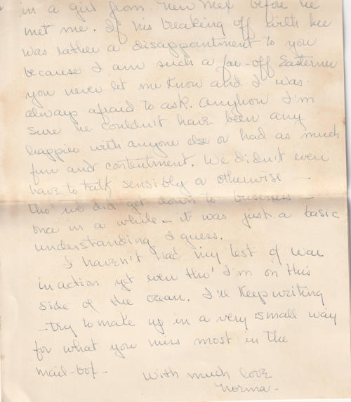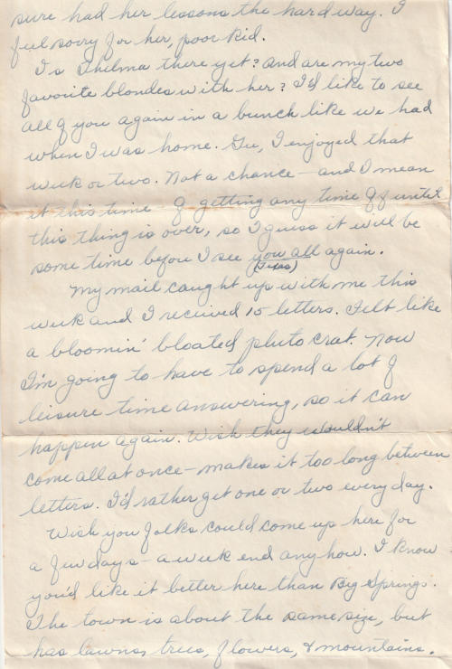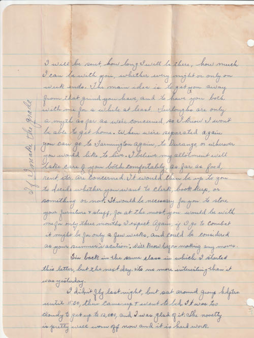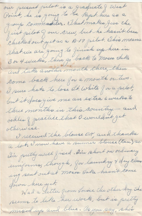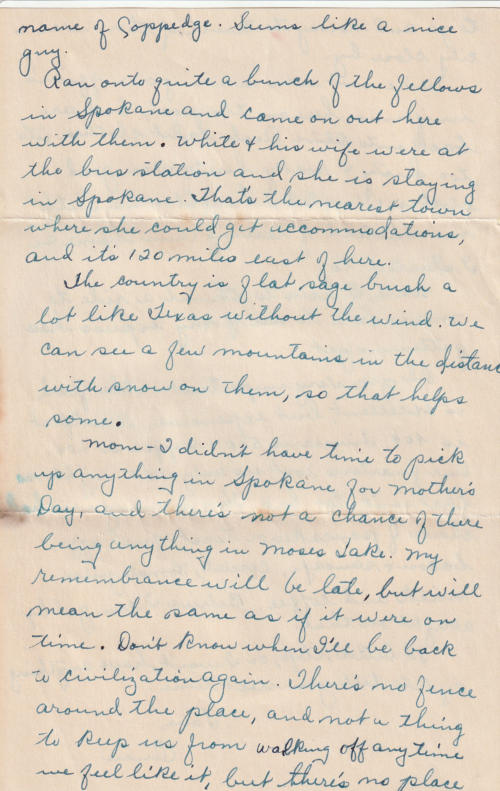 p1: Dear Folks, Now I know why I got all the grins everytime I mentioned Moses Lake as my destination! Believe me, this is the jumping off place! The field is just under construction, and was not to be occupied for another two to three months. The barracks are pretty nice, but that’s all you can say on the advantages. Disadvantages are many, and too many to mention. We are about 7 miles from the town of Moses Lake. It’s justa little larger than Flora Vista, not so large as Aztec! It has one combined theater and grocery store - shows are three nights each week. There is p2: a large lake that stretches from below town out to the field. I saw a notice that fishing tackle can be checked out at the officer’s club, soI guess that is the main form of entertainment.