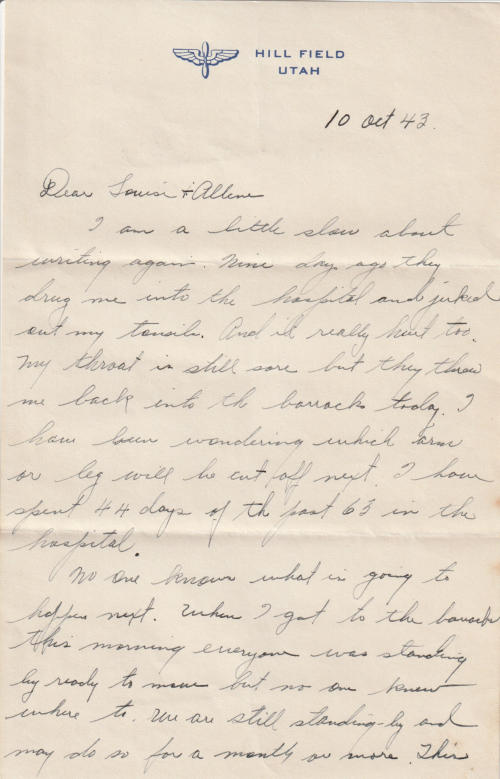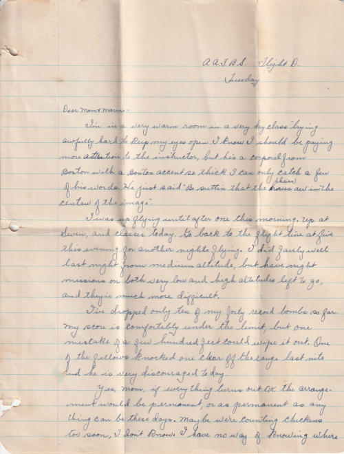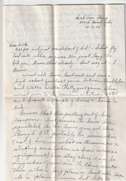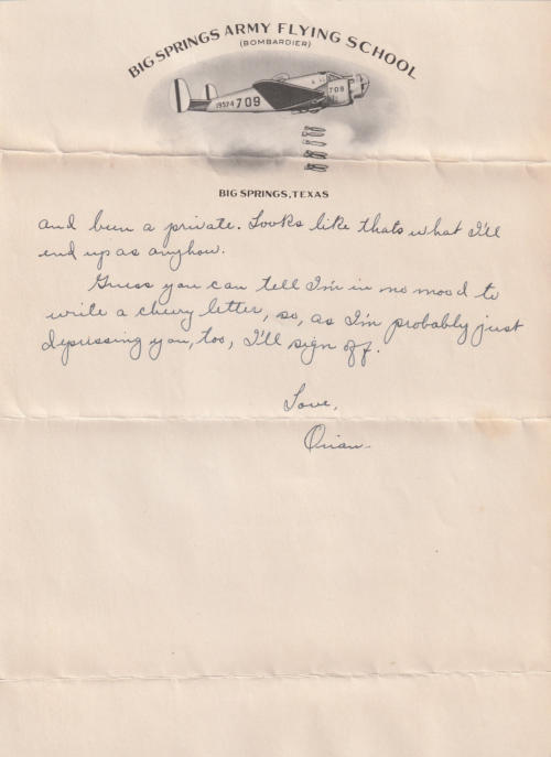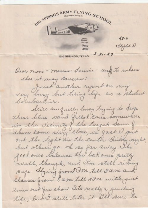 •1-Orian US Army Air Forces Bombardier 1942-44oSchooling era letters •Walla Walla, Washington▪Uncertain Dates-88th Bomb Grp•Tues •Thurs•Sun▪9-8-1943▪10-6-1943▪10-9-1943•Moses Lake, Washingtonounknown date- 96 Bomb Group Sq 595 BOQ7•Kelly Field, Texaso9-25-1942 Scolding sister Marene over dating•Big Springs, Texas 1943•Ellington Field, Texas