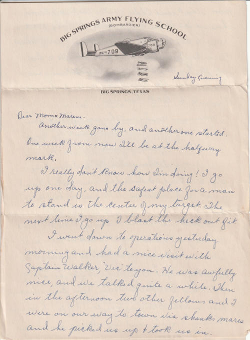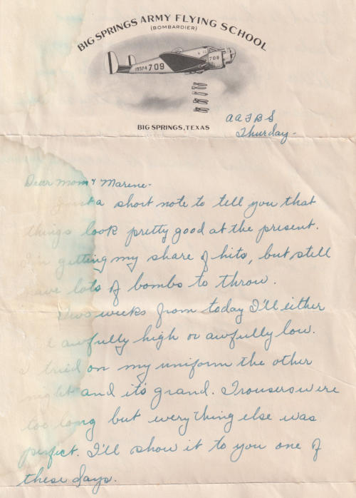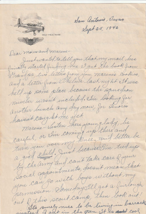 San Antonio, Texas; Sept 25, 1942Dear Mom and Marene,Just wanted to tell you that my mail has finally started finding me. I got the book from Grandpa, two letters from you, Marene’s cookies, and a letter from Thelma last night. It was held up some place because the squadron number wasn’t included. I am looking for another bunch because Lenore’s haven’t caught me yet. Marene, listen here, young lady, be careful or I’m coming up there and turn you over my knee.You’d better be a good child. Just because I’m tied up by the Army and can’t take care of your social appointments doesn’t mean you can go with boys without my permission. Someday I’ll get a furlough out of this scout camp, then look out!It’s surely nice to be living in barracks instead of out in the open. It is cool in here compared to the tents and so much cleaner. I have a nice closet in which to hang my clothes. My laundry which was lost finally showed up, so I am pretty well situated now. I guess it just takes